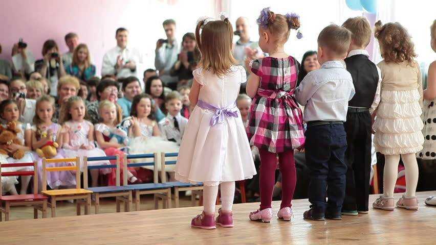 В назначенный день все собираются в актовом зале. Родители садятся на места для зрителей, а воспитанники сада отправляются за кулисы вместе с воспитателями. Дети в возрасте от 2 до 3 лет не всегда могут выступать на сцене, особенно когда видят в зале родные лица, они тут же отказываются читать стишки и устремляются к своим мамам. Вот почему в некоторых залах бывают специальные ширмы, через которые родители могут наблюдать за выступлением своих малышей, при этом оставаясь незамеченными.