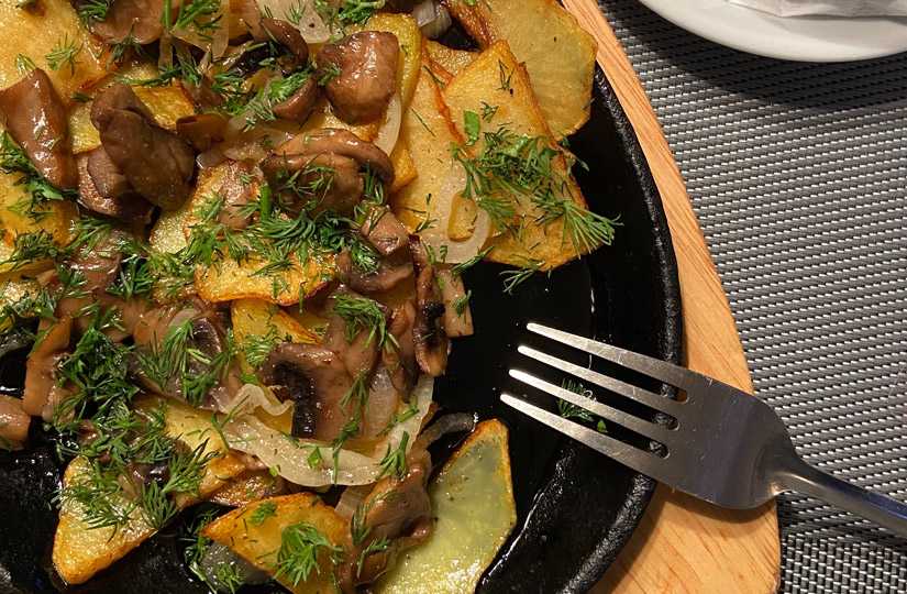 - Посолите картошку, соедините с луком и грибами, доведите до готовности.