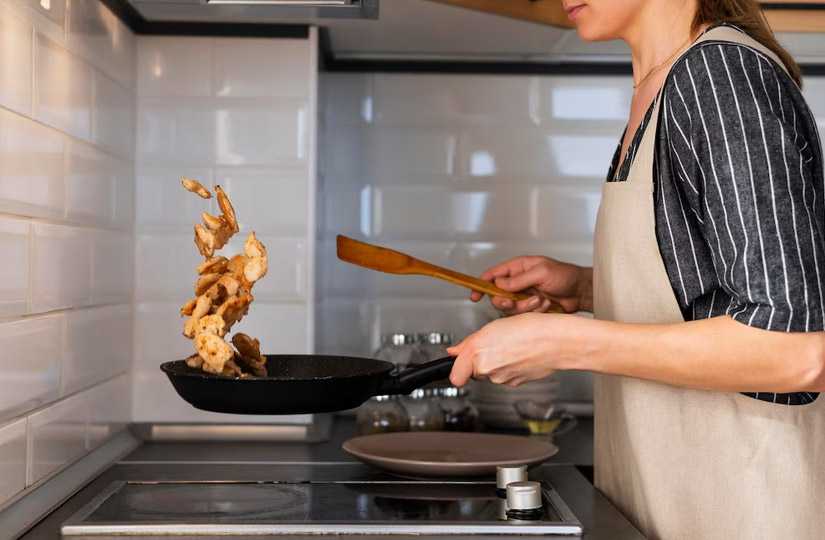 Пять минут нужно жарить на большом огне, периодически помешивая лопаткой.