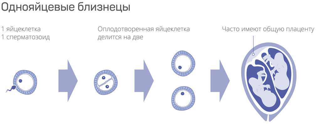 Есть другой вариант. Яйцеклетка одна, но после оплодотворения она расщепляется на две или три идентичные части. Они будут развиваться самостоятельно и станут эмбрионами. Так происходит в организме женщины при естественном зачатии двойни или тройни.