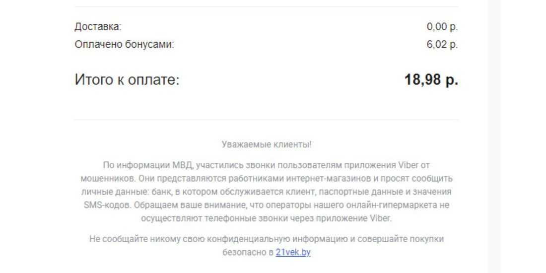 — К сожалению, эту схему используют мошенники не только в Беларуси, но и в странах-соседях. В фокус попадают крупные компании с большой клиентской базой, например, в России это «Сбер», в Украине — «Приватбанк». 21vek.by — один из крупнейших онлайн-ретейлеров в Беларуси, у нас более 2,5 млн постоянных клиентов, поэтому, осуществляя звонок рандомно любому белорусу, у мошенников есть большой шанс дозвониться именно до нашего клиента. Мы знаем, что в последнее время такие случаи участились, и с сентября предупреждаем всех клиентов об этом на странице оформления заказа в десктопной и мобильной версии сайта, а также в письме подтверждения заказа.