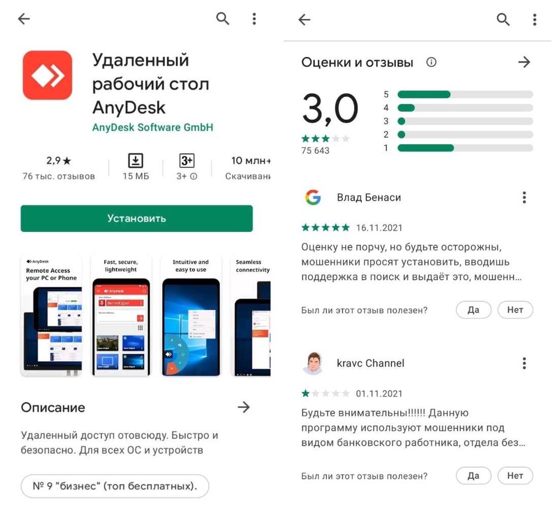 — Мне говорят: давайте мы сейчас все настроим, включайте громкую связь, заходите в Google Play и качайте AnyDesk. В милиции про это приложение уже знают прекрасно — оно позволяет удаленно управлять рабочим столом телефона или компьютера. Это я потом уже про него почитала, увидела плохие отзывы (рейтинг 3 в Google Play), а тогда установила без задней мысли.