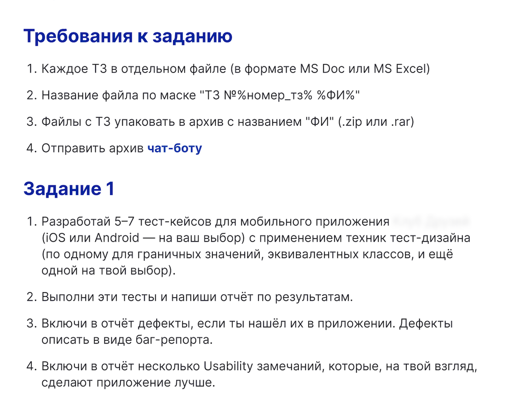 Своё первое тестовое я получила, когда училась в университете и хотела попасть на стажировку. Сейчас в компании, где я работаю, мы тоже отправляем будущим стажёрам тестовые с задачами, приближенными к реальной работе. Последнее было таким: установить наше приложение из стора, погонять его без определенных требований, выписать все замечания и странности, оформив как баг.