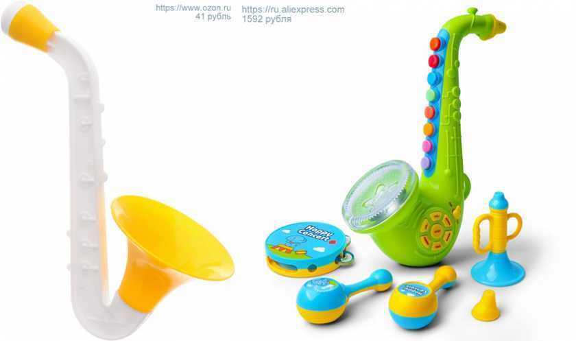 — саксофон – до невозможности простая игрушка для детей от года – если сильно подуть в мундштук саксофона, то музыкальный инструмент издаст громкий звук. Модели подороже включают в себя клавиши, нажатие на которые меняет звучание инструмента.
