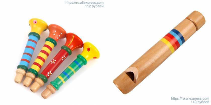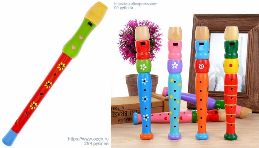 — флейта – детская копия духового инструмента представляет собой любопытный для малыша инструмент, играть на котором можно с помощью закрывания в соответствующей последовательности дырочек. Детская флейта выполнена из дерева, выкрашенного нетоксичными красками, и очень похожа на настоящую.