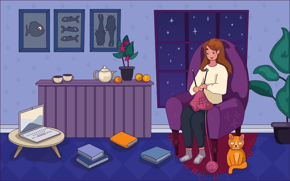 Вязание – это работа, которой можно заняться в любом месте. Если мы вяжем в одиночестве, то думаем и размышляем о сокровенных мыслях. Если мы вяжем в компании, то общаемся, что развивает навыки коммуникабельности. В обоих случаях наш мозг высвобождает эндорфины, которые расслабляют и создают ощущение благополучия.