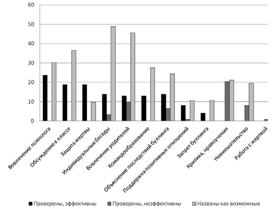 Наиболее прикладным вопросом является реагирование взрослых на ситуации буллинга. Респонденты перечисляли а) известные им способы реагирования, б) способы реагирования, которые они лично опробовали и могут охарактеризовать как эффективные или неэффективные, в) способы реагирования, которые, как они считают, усугубляют отношения травли в группе. Наиболее распространенные ответы отражены на рис. 3 (в процентах респондентов, давших такие ответы).