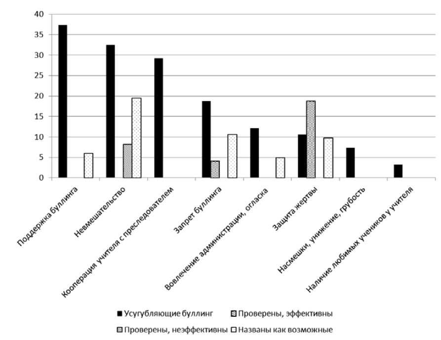 сечения с предыдущим перечнем: как возможные способы реагирования на буллинг, которые его усугубляют, перечисляются поддержка буллинга, невмешательство (также проверенное и признанное неэффективным), запрет буллинга (который около 4% признали эффективным способом), а также вовлечение администрации, защита и специальная опека жертвы (признана эффективной почти 20% респондентов). Согласованность ответов и частичное совпадение со списком опробованных способов показывают, что респонденты имеют вполне сформированное и ясное представление о том, что именно катализирует буллинг в поведении учителя.
