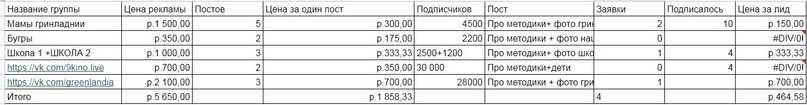 На рекламу в группах потратил 5650 руб. Количество заявок на пробное 10.