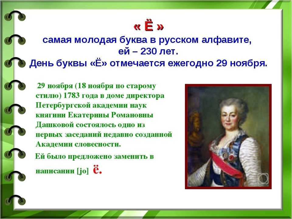 - Именно княгиня ввела в алфавит букву Ё и немало потрудилась на собиранием слов для словаря на такие буквы, как Ц, Ш и Щ.