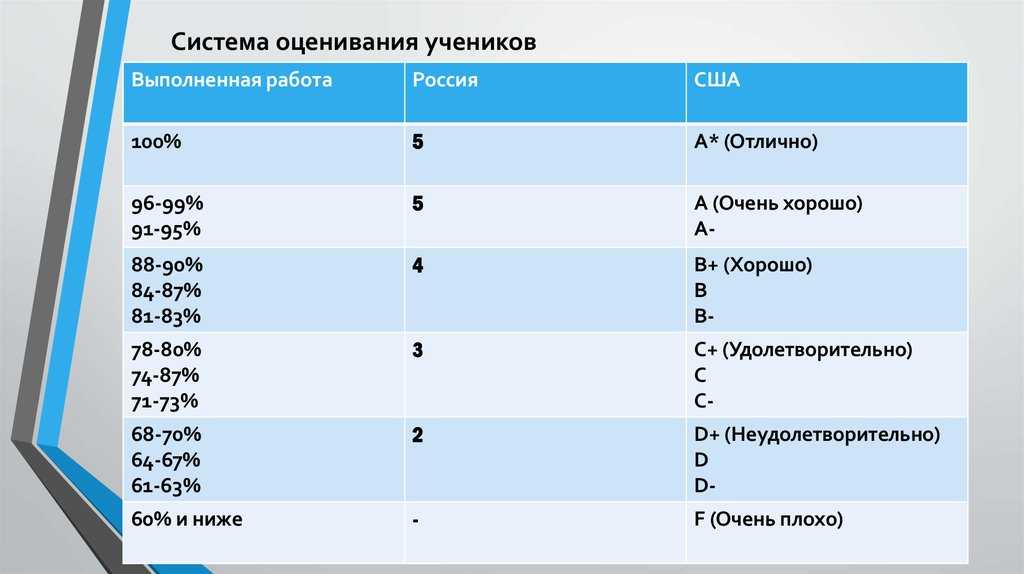 Сравнивая противоположные системы образования, можно утверждать, что различие заключается и в подходе оценивания. В российских школах и других учебных заведениях используется пятибалльная система оценок. В Америке применяют другой подход для оценки работы ученика или студенты. Их система состоит из букв с шкалой от A до F. Чтобы точнее дать оценку преподаватели используют «+» и «-». Также в младшей и средней школе используют стобальную систему, которая отражает глубину знаний ученика.