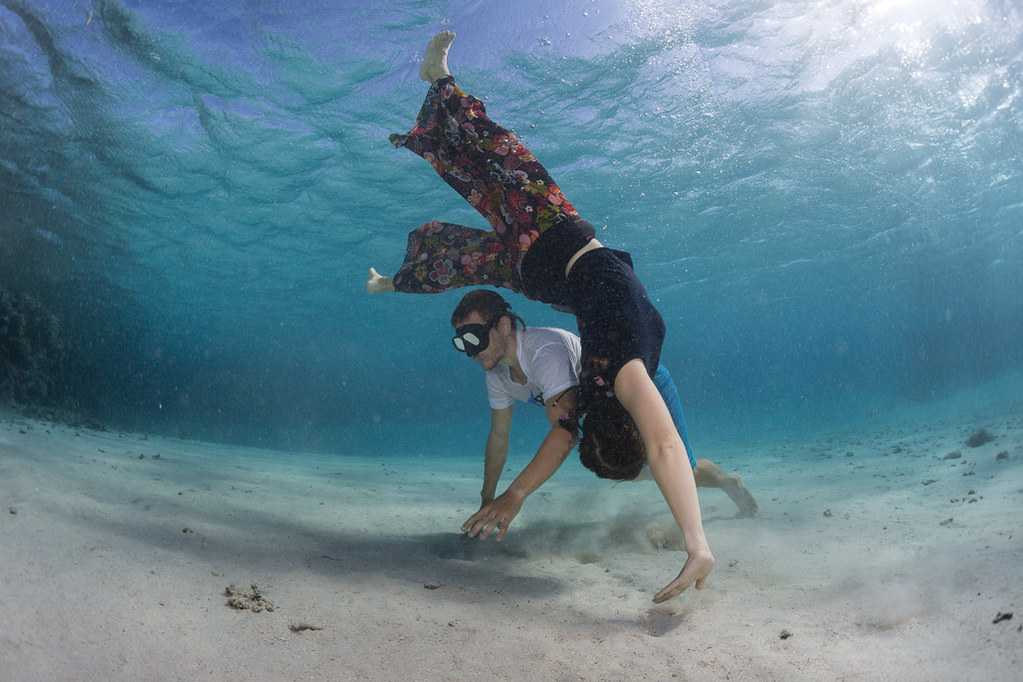 Что касается фридайвинга, то мы просто добавили элементы фридайвинга в фестиваль в качестве подготовки к танцу. Сам танец в данном случае происходит на мелководье, поэтому фридайвинг здесь не для ныряния на глубину, а просто чтобы добавить людям уверенности во время танца. Очень многие не имеют опыта задержки дыхания, отчего порой возникает скованность и неуверенность в движениях в воде. Фридайвинг здесь помогает обрести комфорт нахождения в воде, учит задержке дыхания во время движения.