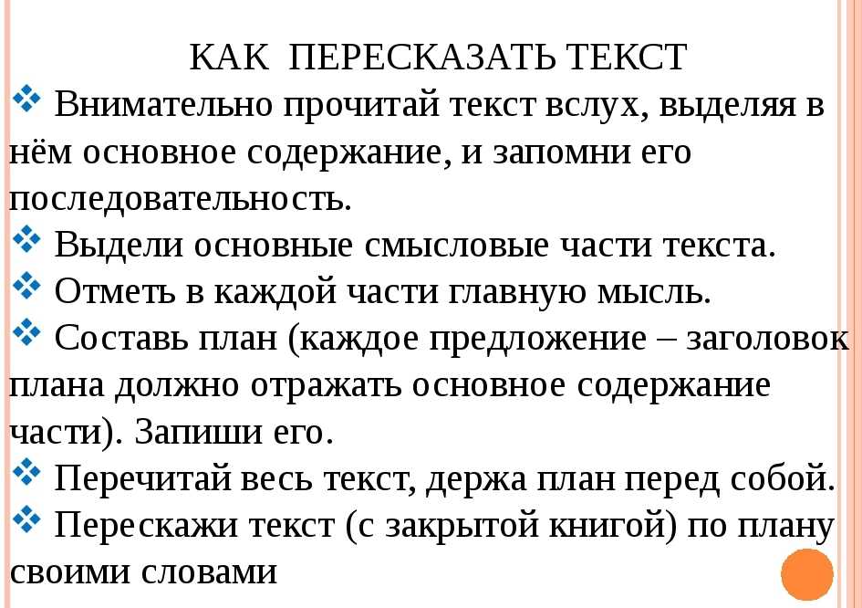 Пересказ — один из важнейших видов работы, который объединяет все предметы в школе, как гуманитарные, так и технические. Обычно под пересказом понимают изложение прочитанного текста своими словами.