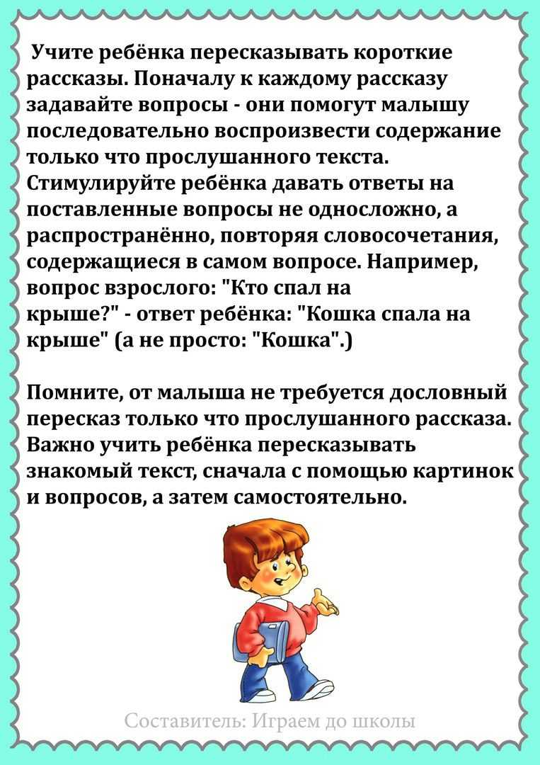 Готовясь к пересказу, малышу необходимо научиться выделять основные моменты прочитанного, запомнить последовательность основных действий и событий и поведать об этом своими словами. При этом рассказ будет зависеть от того, насколько у ребенка развита речь и богат словарный запас. Об этом родители обязаны проявить заботу еще до начала школьного периода. С будущим школьником необходимо говорить, петь песни, читать вслух, разучивать стихотворения. Возможность общаться с родителями хорошо помогает ребенку в развитии речи.
