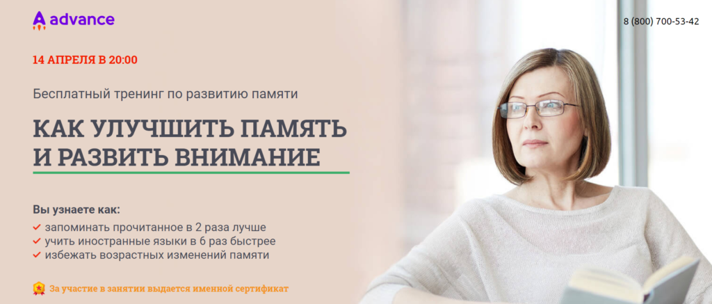 Еще один эффективный метод улучшения памяти — бесплатный мастер-класс «Как улучшить память и развить внимание» от образовательного центра Advance