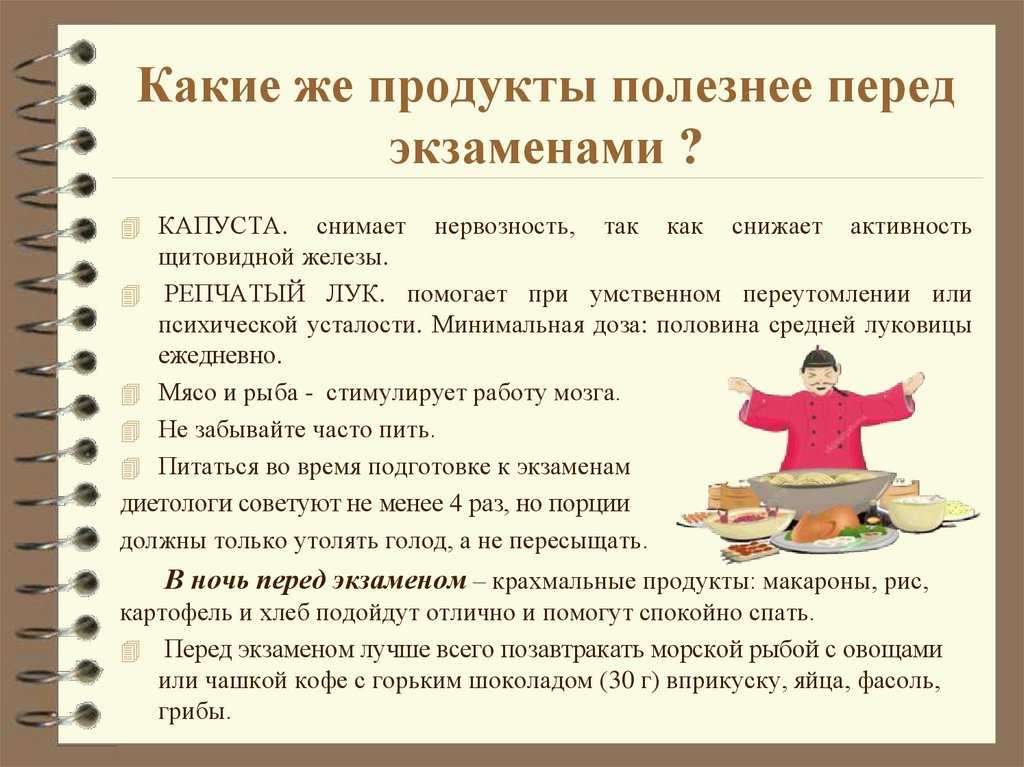 Питание. Рацион в эти недели должен быть особенно разнообразным, чтобы организм получал все необходимые ему микроэлементы. Именно сейчас, когда он испытывает большую нагрузку, ему необходимо больше ресурсов для восстановления. Сейчас стоит обойтись без жестких диет, поскольку ресурсы организма будут тратиться на поддержание физического состояния. Их просто не хватит на учебу.