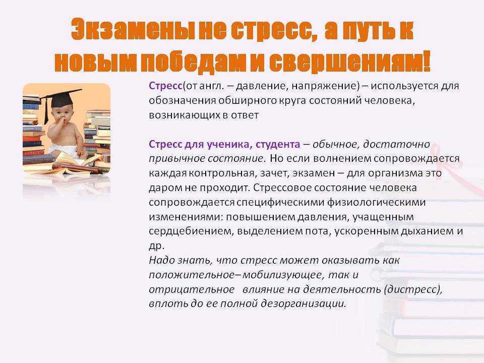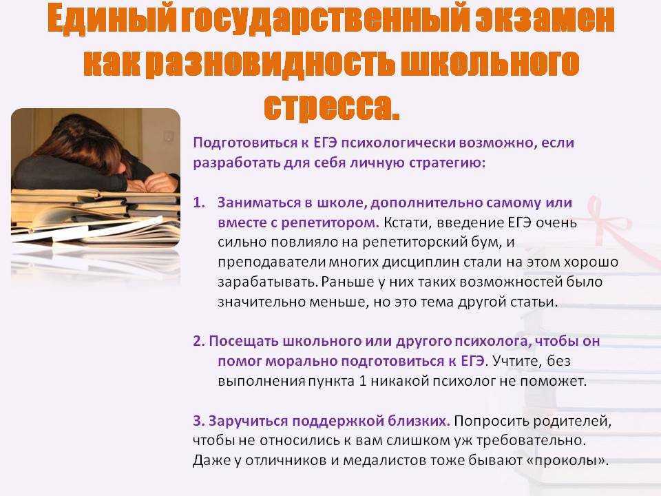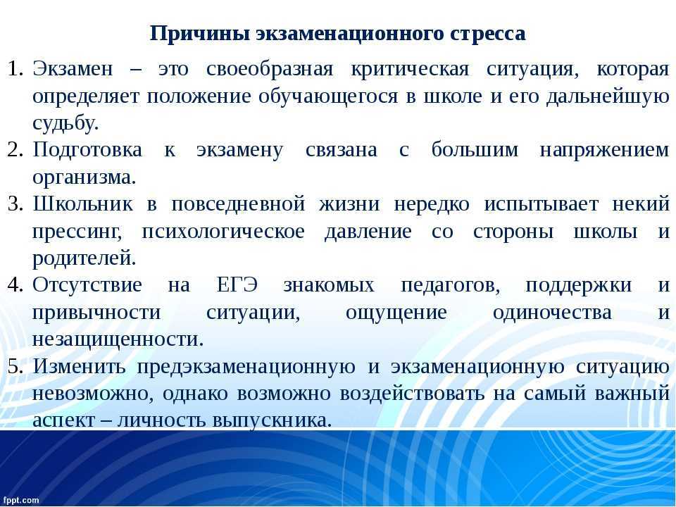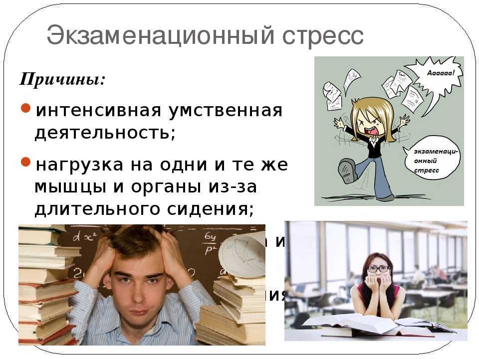 Стресс возникает у учеников по разным причинам, но все они сводятся к одному — ЕГЭ. Чтобы узнать, как справиться со стрессом во время экзаменов, разберемся с каждой причиной подробнее.