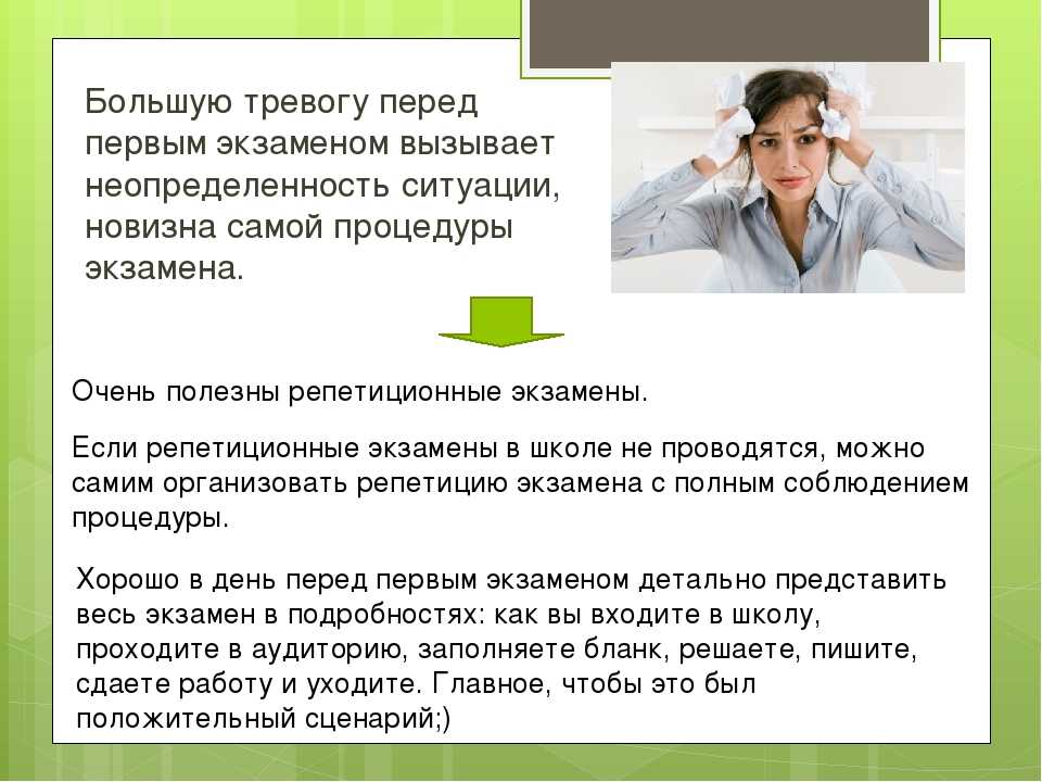 Можно прокрутить мысленно весь ход экзамена с момента входа в аудиторию, тем самым подготовив себя и убрав неизвестность.