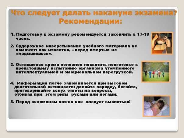 Сон. На фоне стресса перед экзаменами у выпускника может развиться бессонница и желание заниматься даже по ночам. Эффективность таких занятий сомнительна, в то время как организм нуждается в отдыхе сейчас особенно сильно