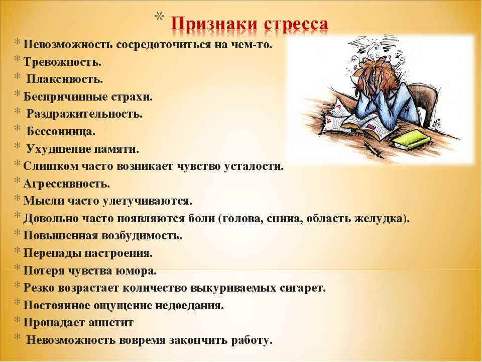 Организм восстает против человека.Тревожность — переживания вплоть до паники, хотя ничего радикального не происходит. Постоянное напряжение не дает отвлечься и расслабиться.Раздражительность — несмотря на приличное воспитание, старшеклассник начинает срываться по мелочам. АЛЁ, Я ТУТ УЧИТЬСЯ ПЫТАЮСЬ, ПРЕДЛАГАЮ ДЫШАТЬ ТИШЕ И ДАЛЬШЕ! ДОГОВОРИЛИСЬ? ДОБРО!Падение концентрации — фокус внимания начинает скакать. Чего?