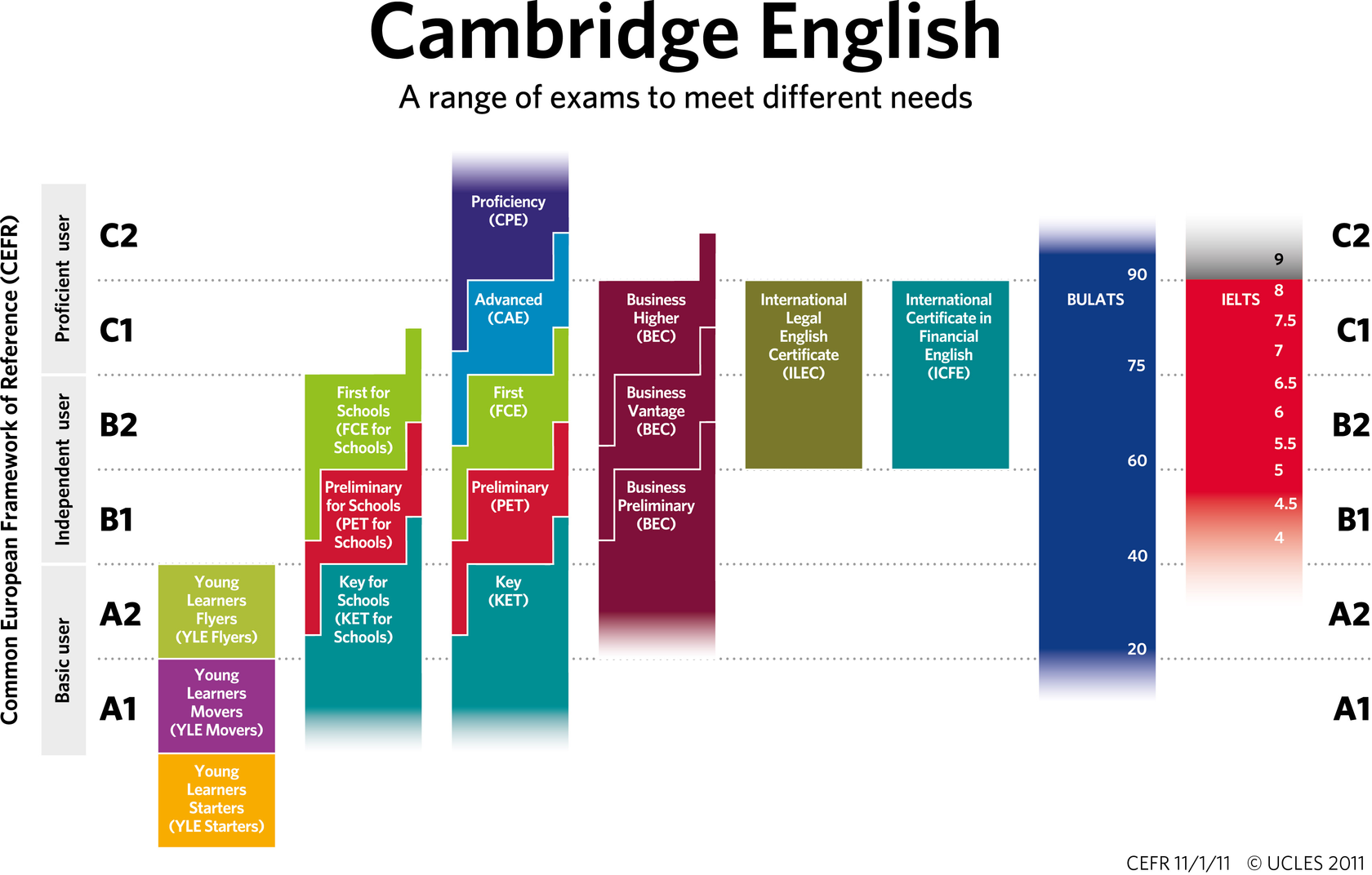 | Pre-A1 StartersA1 MoversA2 FlyersA2 Key for SchoolsB1 Preliminary for SchoolsB2 First for SchoolsC1 Advanced2 Proficiency | A2 KeyB1 PreliminaryB2 FirstC1 AdvancedC2 Proficiency | B1 Business PreliminaryB2 Business VantageC1 Business High |