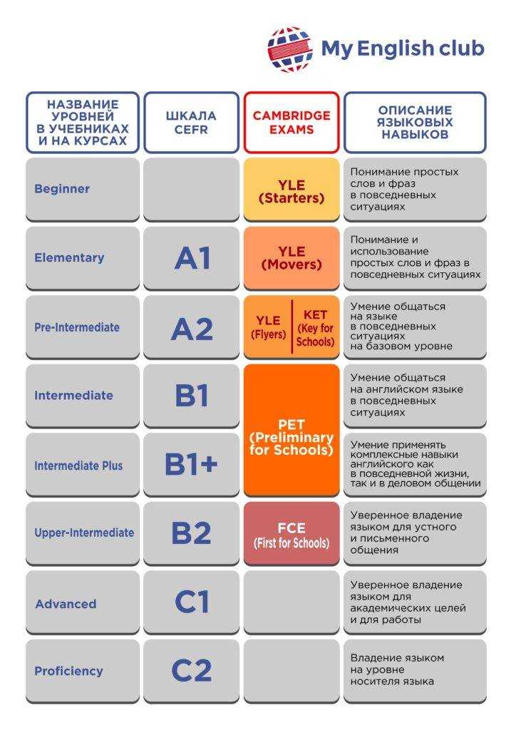 - Elementary (Pre-Intermediate), (A2) – элементарные знания;
