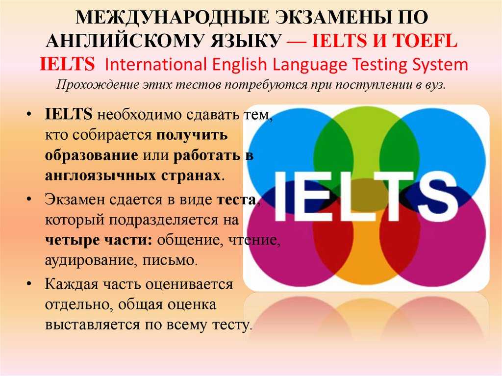 IELTS (International English Language Testing System) – наиболее востребован в Великобритании, Австралии, Новой Зеландии, Канаде и др. Но его также принимают и в других странах, в том числе в некоторых учебных заведениях США.