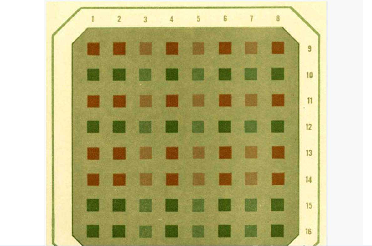 Всех таблиц теста — 12, на каждой таблице изображено по нескольку картинок с таким изображением. Все ячейки образуют один тон, тест построен таким образом, что исключается возможность его «заучивания».