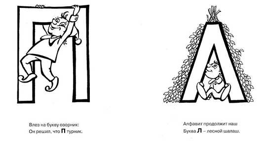 Например, яркие, запоминающиеся для детей образы букв можно найти в букваре Елены Бахтиной (в этой книге есть не только красочные картинки и рекомендации, как рассказать о каждой букве ребёнку, но и цветные шаблоны — буквы из этого букваря можно вырезать и играть в них).