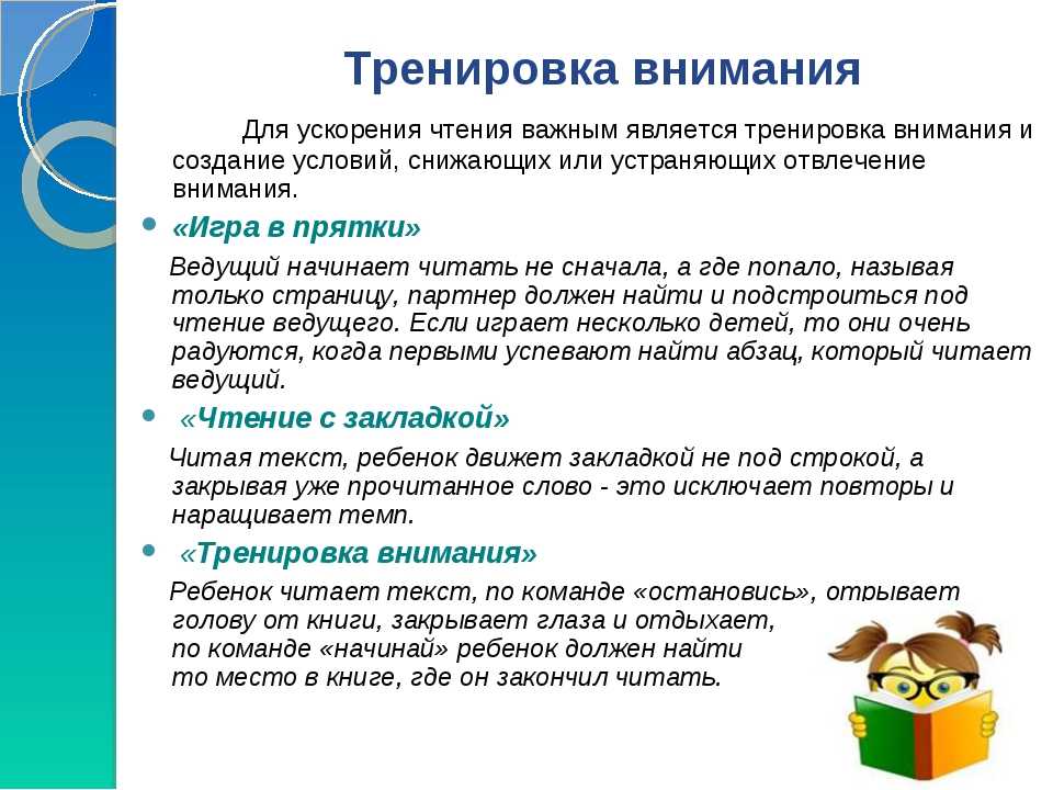 Во время выполнения упражнения «Буксировка» скорость чтения следует изменить с медленной на более высокую. Ребенок не должен отставать в скорости чтения. Затем ученику следует перейти к чтению про себя, которое также следует повторить.
