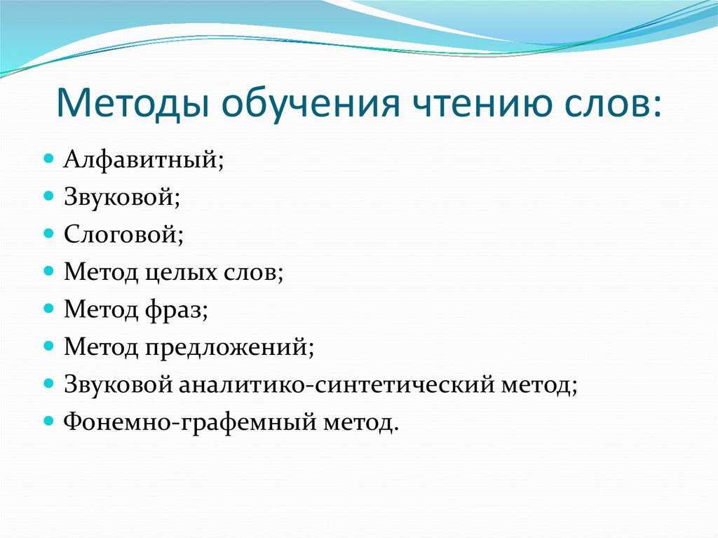 Буквосослагательный метод предлагают в основном зарубежные авторы. Он предполагает изучение букв, в качестве единиц чтения и последующее составление из них слов (побуквенное чтение)