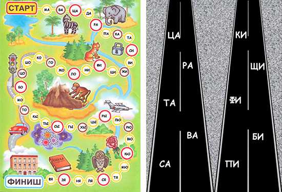 По аналогии с играми-бродилками можно изготовить различные трассы со слогами, на которых будут соревноваться различные транспортные средства: кто без ошибок и как можно скорее проедет дорожку. Для этого вам понадобится картон / ватман, на котором будет нарисована трасса со слогами, и игрушечные машинки / грузовики /поезда / самолетики. Помните, что детей очень легко увлечь, добавив на занятиях соревновательный момент.