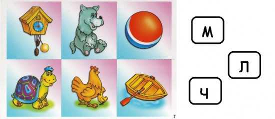 Игра необычная, но очень эффективная для развития скорости мышления, чтения в будущем. Малышу нужно вспомнить название предметов, выделить первую букву в слове и произнести только ее, положив на картинку карточку с буквой.
