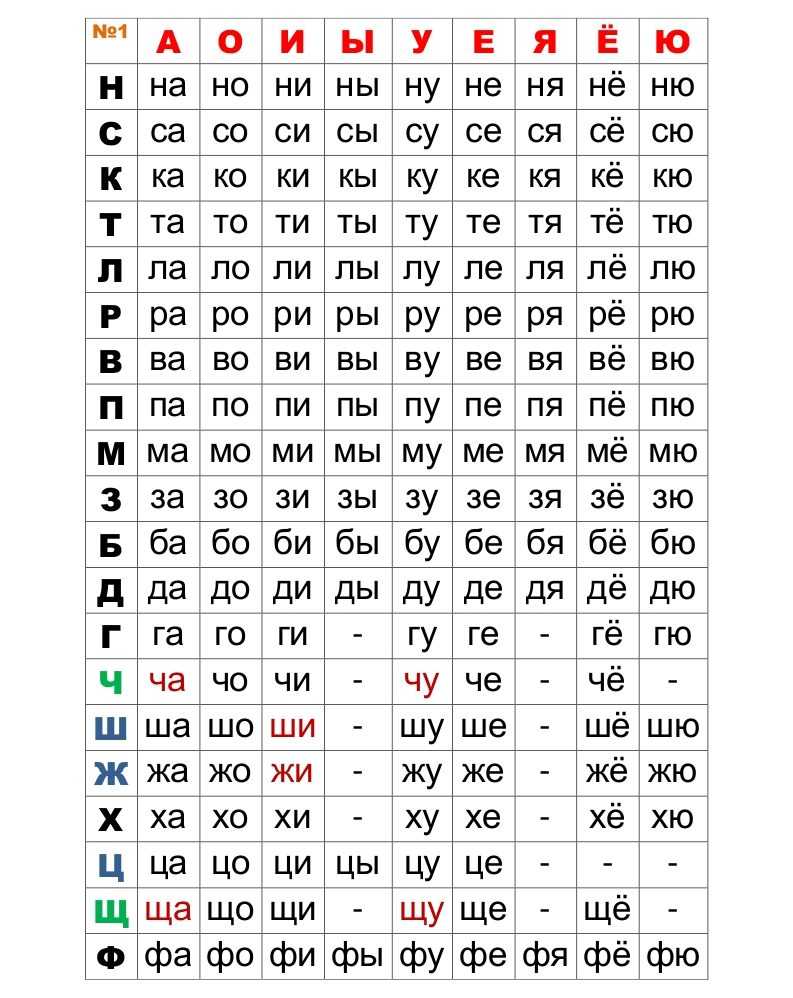 Таблицы слогов — отличный способ выучить. Это особые наборы, состоящие из слогов, повторяющихся несколько раз подряд. Таблица ниже является лучшим примером этого: