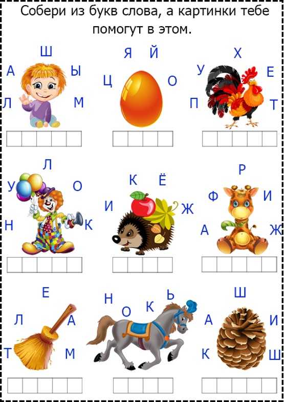 Ребенок называет правильное слово, потом прислушивается к себе и подбирает буковки для записи в клеточках.