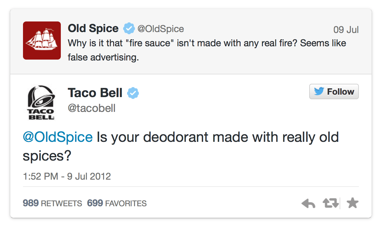 Но в любом случае, игра стоит свеч. Передразнивание также может быть особенно эффективным, как это уже доказали ниндзя Twitter’a Old Spice и Taco Bell в своем обмене любезностями ниже: