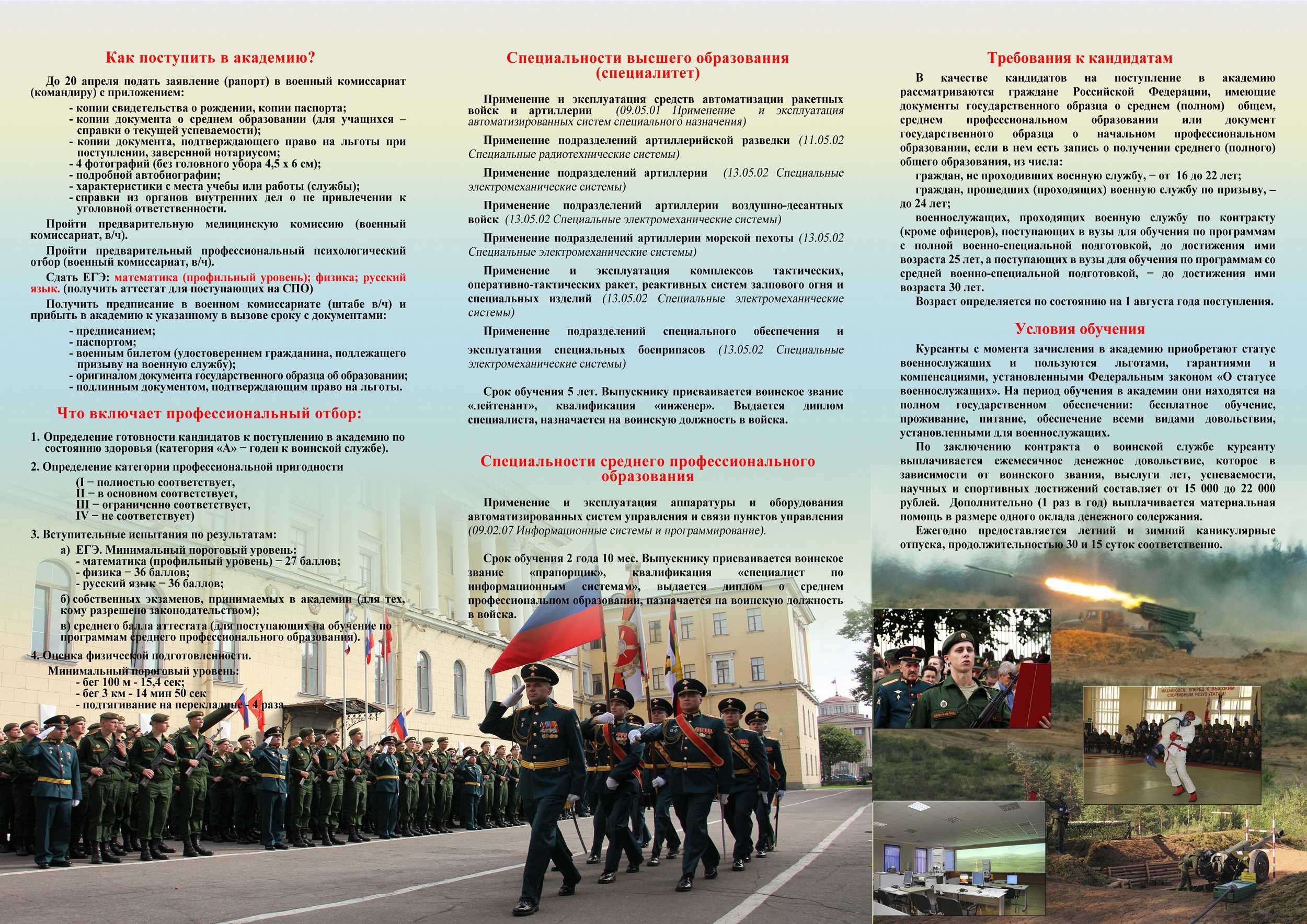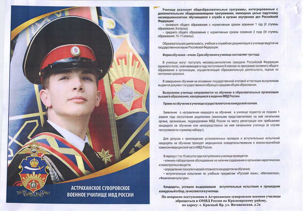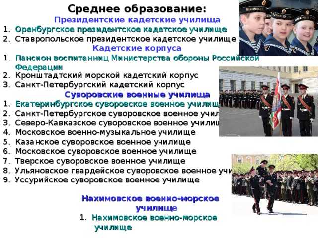 Подробнее:В суворовские военные, нахимовское военно-морское училища и кадетские корпуса со сроком обучения 2,3 и 7 лет могут поступать несовершеннолетние граждане Российской Федерации мужского пола в возрасте не старше 16, 15 и 11 лет соответственно (по состоянию на 31 декабря года поступления) , окончившие 9, 8 и 4 класса общеобразовательной школы в году поступления. Они должны быть годными к военной службе по состоянию здоровья, отвечать требованиям профессионального психологического отбора и физической подготовленности.В Московское военно-музыкальное училище могут поступать подростки не старше 16 лет (по состоянию на 31 декабря года поступления) , имеющие основное общее образование, музыкальную подготовку в объеме детской музыкальной школы, владеющие, как правило, одним из духовых или ударных инструментов.Хочу особо подчеркнуть: прием во все суворовские и нахимовское училища, кадетские корпуса проводится на конкурсной основе.Справка: заявление (рапорт) о желании поступить в училище или кадетский корпус подается родителями (лицами, их замещающими) в период с 15 апреля по 15 мая года поступления на имя военкома по месту жительства кандидата. Военнослужащие, проходящие службу за пределами РФ, – на имя командира части или начальника учреждения, предприятия, организации Минобороны РФ.В заявлении (рапорте) родители указывают, что их сын после окончания училища или корпуса будет продолжать обучение в военно-учебном заведении, чтобы стать офицером ВС РФ. К заявлению (рапорту) прилагаются следующие документы: личное заявление кандидата на имя начальника училища (корпуса) о желании учиться в данном учебном заведении; копия свидетельства о рождении; автобиография; выписка из табеля успеваемости за 1-3 учебные четверти 4-го (8, 9) класса с указанием изучаемого иностранного языка; педагогическая характеристика за подписями классного руководителя и директора школы, заверенная гербовой печатью школы.Кандидат, кроме того, представляет четыре фотокарточки размером 3х4 (без головного убора, с местом для оттиска печати) ; копию медицинского страхового полиса; карту медицинского освидетельствования, выданную военно-врачебной комиссией при военкомате или гарнизонной военно-врачебной комиссией; справку с места жительства родителей с указанием состава семьи и жилищных условий.Подлинное свидетельство о рождении или паспорт, аттестат об основном и общем образовании, табель успеваемости по итогам учебного года за 4-й (8, 9) класс, похвальный лист «За отличные успехи в учении» , медицинский страховой полис, подлинные документы, подтверждающие право кандидата на льготы при поступлении, предъявляются кандидатом в приемную комиссию лично.