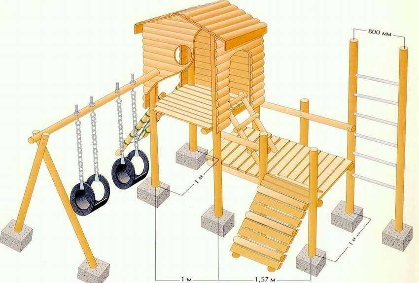 - Если в проекте площадки предусмотрены закладные элементы, например, качели, домик, то глубина их погружения в землю должна составлять как минимум 0,5 метра. Также нужно позаботиться об их усилении, для чего можно использовать бетонные растворы, металлические костыли. Здесь также можно проявить фантазию, используя для этого любые подручные материалы.