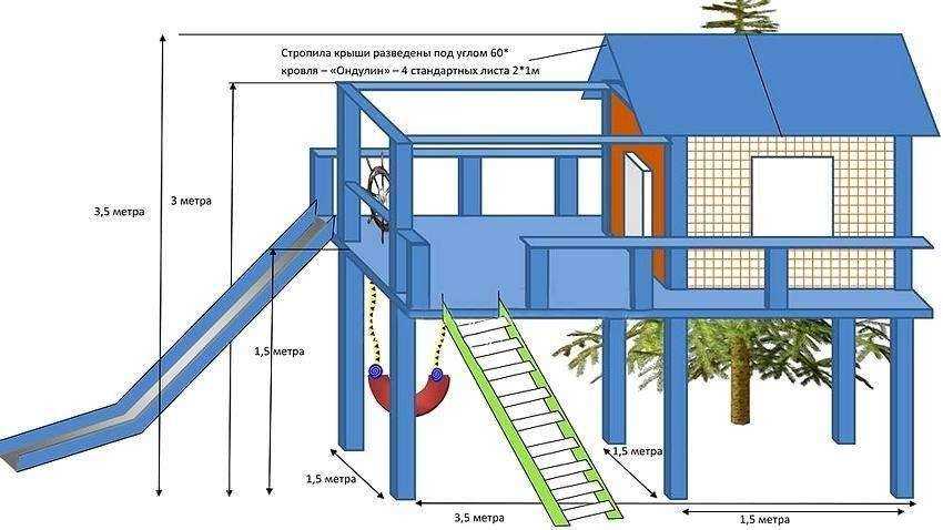 Предпочтительно изначально разработать соответствующие чертежи на листе бумаги. В проектной документации непременно укажите предполагающиеся размеры деталей, которые планируется разместить на площадке. Также определите оптимальный наклонный угол детской горки и, конечно же, высоту.
