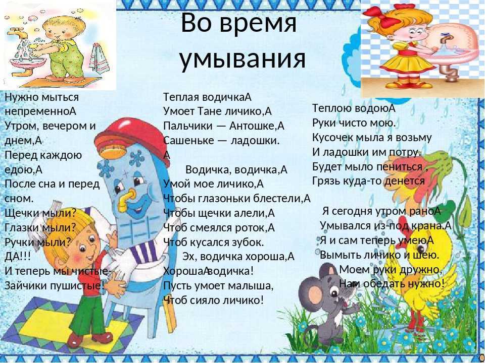 Утренние процедуры всегда сопровождаются умыванием, приучая ребенка к гигиене своего тела. «Водичка, водичка, умой мое личико…», приговаривает мама, умывая своего малыша. Ребенок знакомится с водой, понимает, что ею надо умываться, оставаться чистым и аккуратным. Можно проговаривать с ребенком, который не любит умываться игровые потешки: «От водички, от водички», «Плыви ко мне, рыбешка». Ребенок переключается на игру и начинает сам умываться.