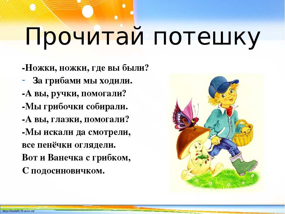 Есть потешки, которые позволяют повторять с ребенком все части тела: «Для чего сыночку ножки?», «Ротик мой умеет кушать». Произнося такие потешки можно не только показывать руки, ноги, нос, уши ребенку, но и поглаживать их, успокаивая его.