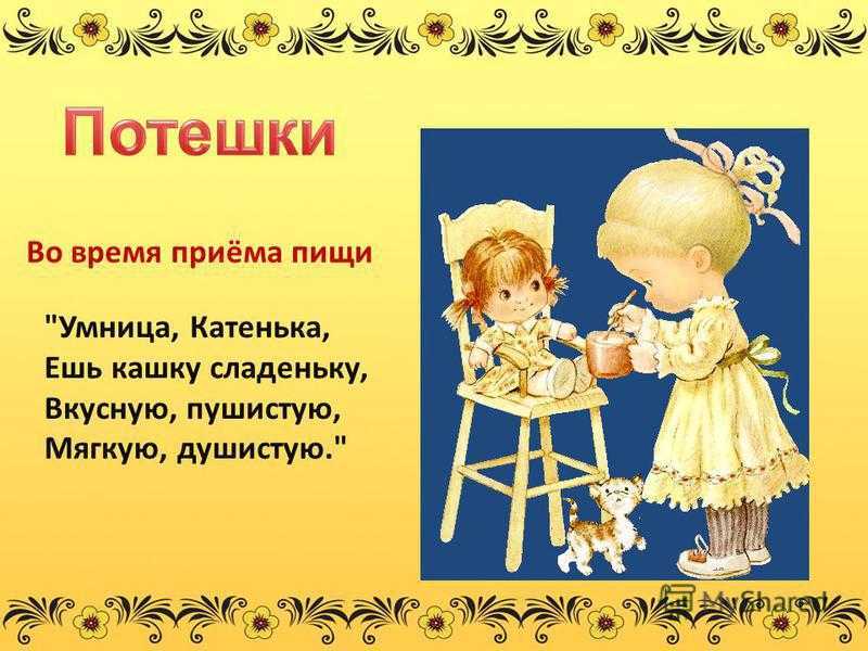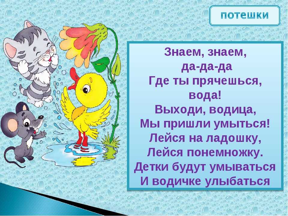 Во многих потешках рассказывается о пользе умывания, правильного поведения во время еды, о том, что нужно заботиться о своем организме.