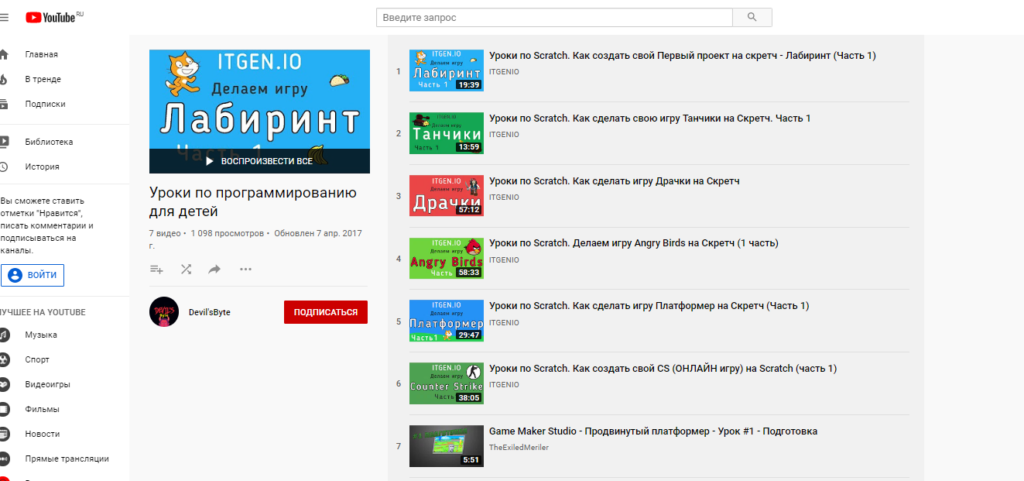 Автор курса – Devil’sBit (Богдан). Занятия, имеющие 1000+ просмотров, предназначены для младших школьников, им предложен язык Scratch.