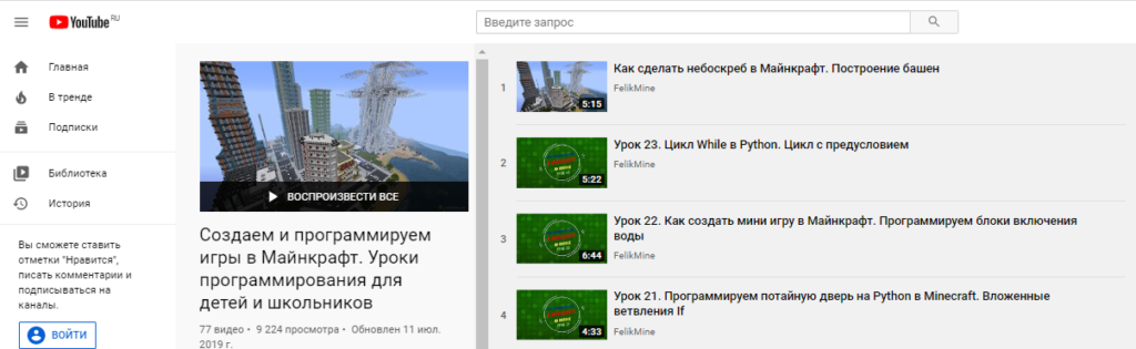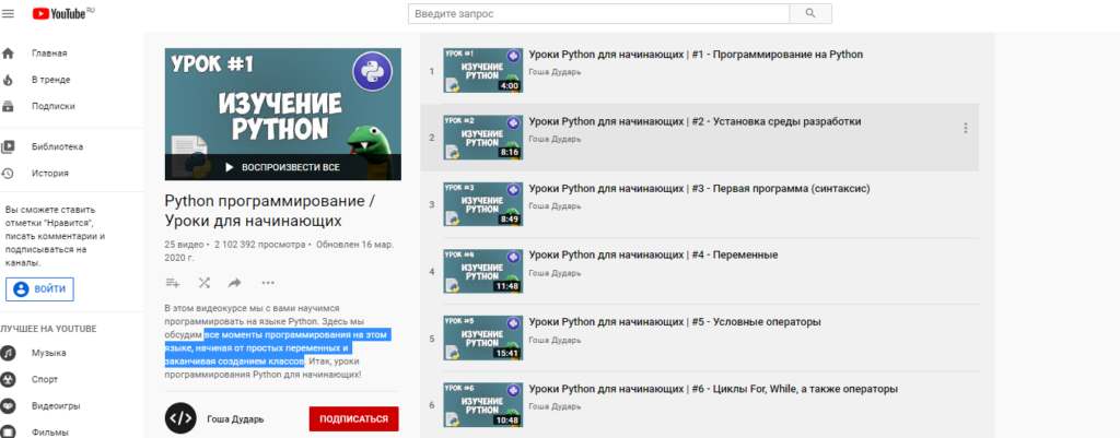 Автор курса – Гоша Дударь. На канале выложена подборка 25 уроков, имеющих 2,1 млн просмотра. Школьникам, увлеченным программированием, предлагается изучить основы языка Python.