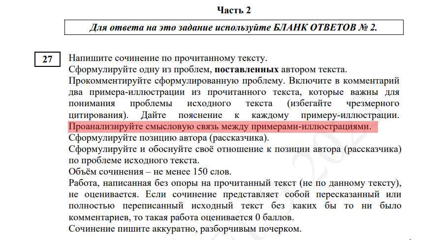 Вероятно, изменение формулировки задания №27 второй части ЕГЭ по русскому языку было вызвано жалобой одного из участников прошлогоднего экзамена, который попытался оспорить снятые баллы, сосредоточившись на требовании «указать» связь, а не «проанализировать». Теперь новая формулировка задания более конкретна и требует от экзаменуемых детального анализа смысловой связи между элементами с использованием примеров-иллюстраций. Однако, суть задачи осталась неизменной — написание сочинения с полным раскрытием темы, анализом и аргументацией.