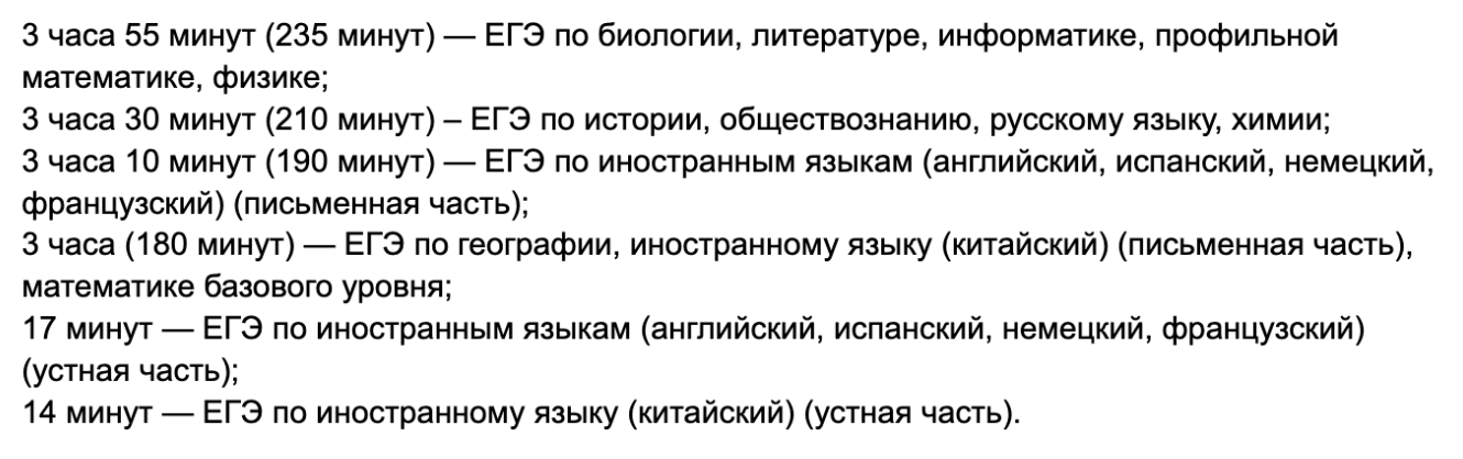 Продолжительность экзаменов отличается в зависимости от предмета: