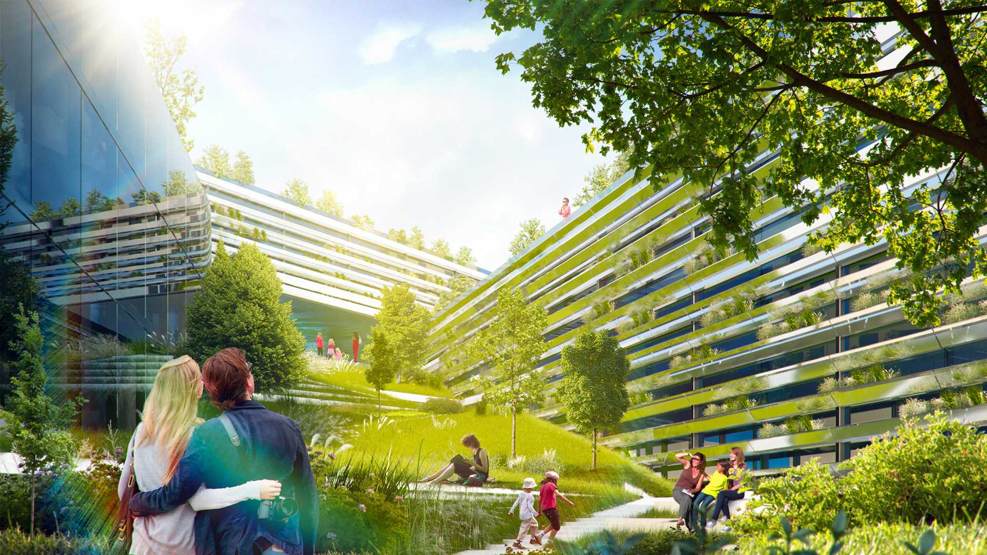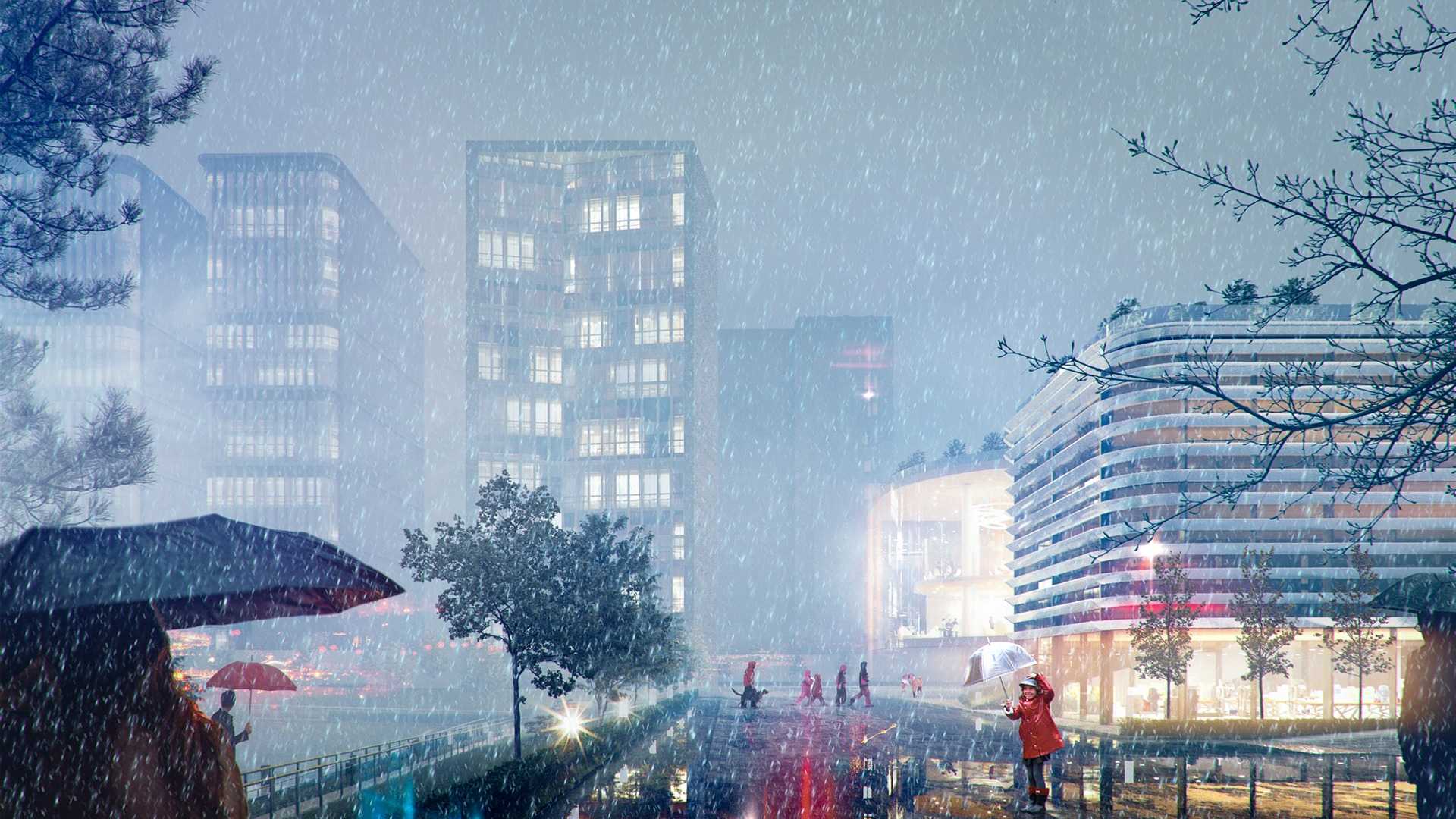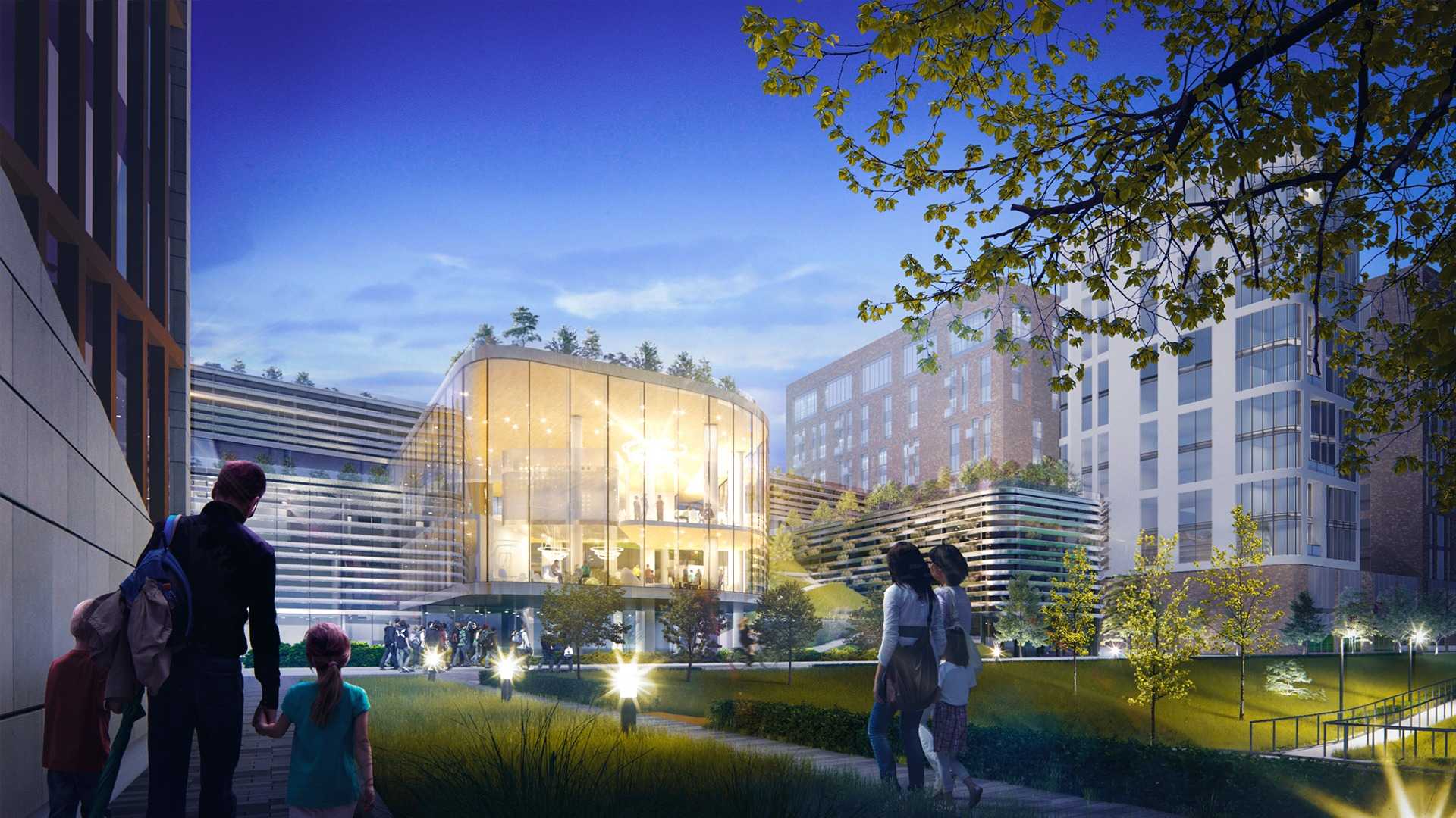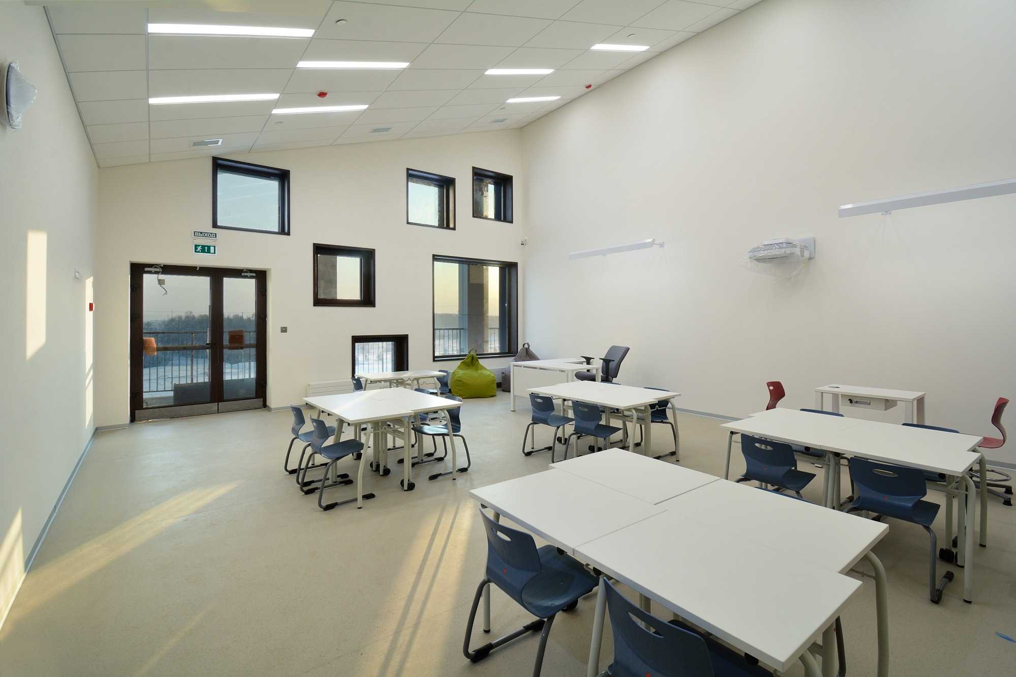 Еще один проект UNK project, выполненный для международного конкурса вместе с Storaket и «Умной школой». Концепция в том, чтобы большинство учебных процессов шли не в традиционных классах, а в пространстве между классами в групповой работе. Для реализации этой идеи центральное здание сделали прозрачным — оно связывает начальную, среднюю и старшую школу. Здесь есть открытые и полузакрытые пространства, которые можно трансформировать, всего предусмотрено до 30 вариантов перестройки. Вместо классического школьного двора — искусственной зеленый холм между двумя корпусами, опускающийся к пруду. Зеленая лестница должна не только увеличить процент озеленения, но и привить ученикам любовь к природе.