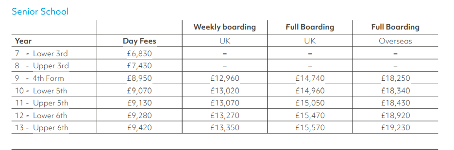 Обучение в частных школах стоит от £15 000 до £24 000 в год за дневную школу и £26 000-£40 000 за полный пансион, соответственно, £105 000-£280 000 за 7 лет обучения в старшей школе. Суммы не включают дополнительные кружки, форму, снаряжение, поездки и экскурсии (ещё плюс 4-8%).