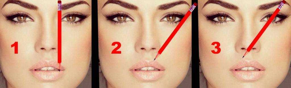 - Дальше карандаш помещается по линии крыла носа и внешнего уголка глаза. В том месте, где карандаш пересекает линию брови, следует поставить точку – это её окончание.