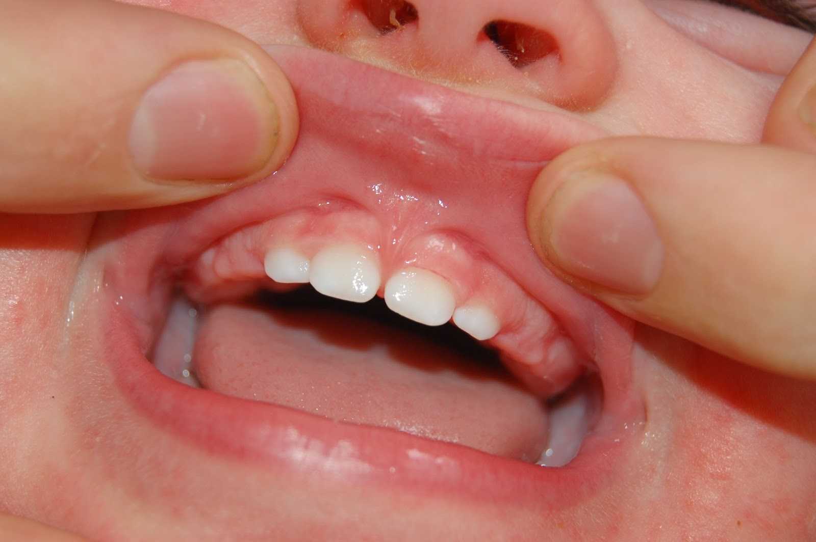 Короткая уздечка нижней губы — встречается реже, так же может приводить к проблемам с сосанием, и рецессиям десны в будущем. Лечение аналогично предыдущей аномалии и в возрасте 6-7 лет (после прорезывания 4 нижних резцов).